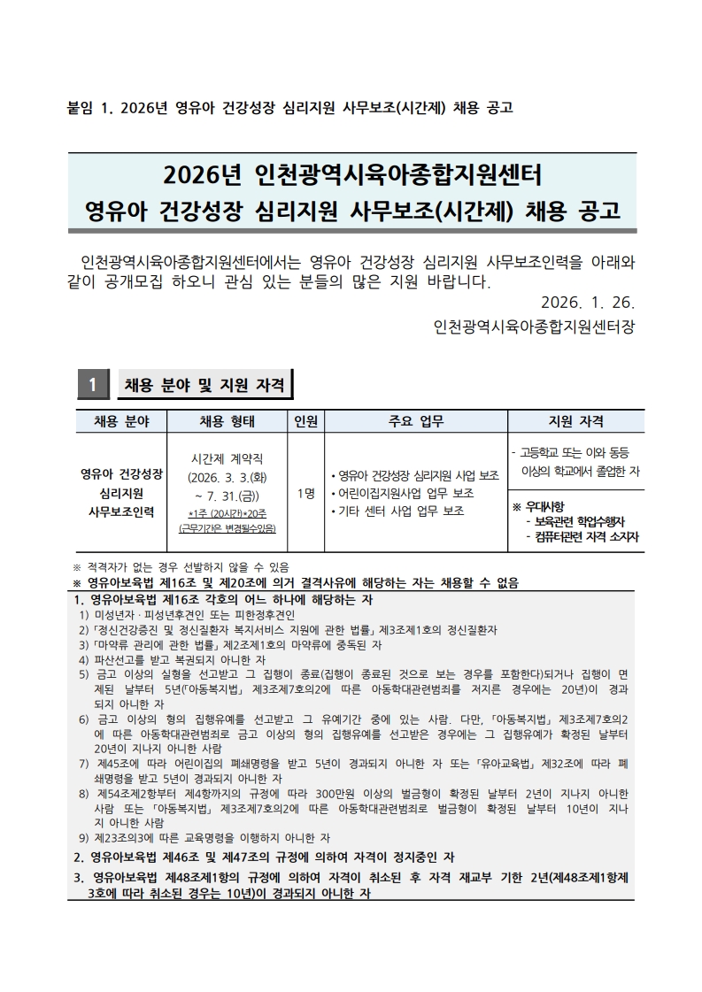 | [ÀÎõ½ÃÀ°¾ÆÁ¾ÇÕÁö¿ø¼¾ÅÍ] 2026³â ¿µÀ¯¾Æ °Ç°¼ºÀå ½É¸®Áö¿ø »ç¹«º¸Á¶(½Ã°£Á¦) ä¿ë°ø°í | |||||