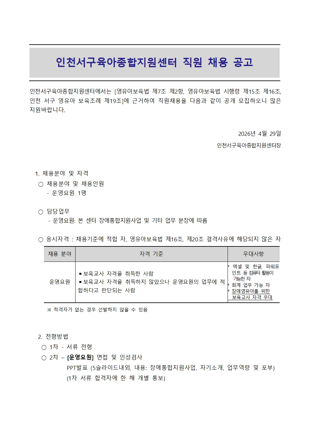 [¼±¸À°¾ÆÁ¾ÇÕÁö¿ø¼¾ÅÍ] ¿î¿µ¿ä¿ø Á÷¿ø ä¿ë