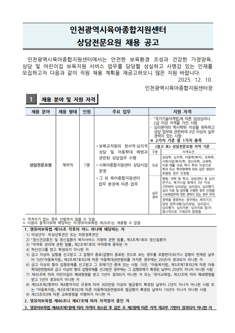 | [ÀÎõ½ÃÀ°¾ÆÁ¾ÇÕÁö¿ø¼¾ÅÍ] »ó´ãÀü¹®¿ä¿ø ä¿ë °ø°í | |||||