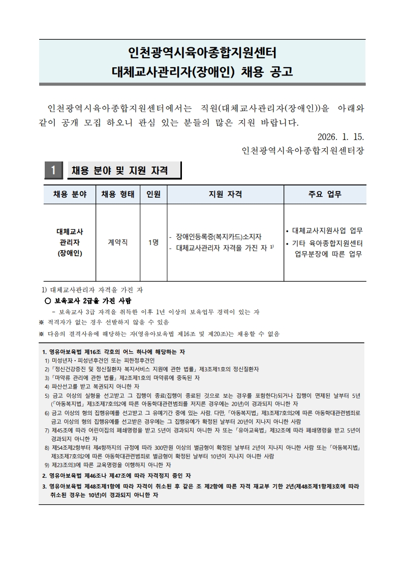 | [ÀÎõ±¤¿ª½ÃÀ°¾ÆÁ¾ÇÕÁö¿ø¼¾ÅÍ] ´ëü±³»ç°ü¸®ÀÚ(Àå¾ÖÀÎ) ä¿ë °ø°í | |||||