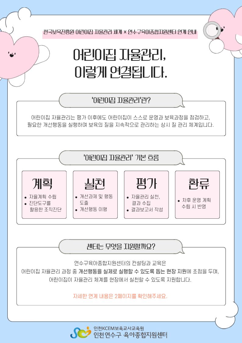| Çѱ¹º¸À°ÁøÈï¿ø ¾î¸°ÀÌÁý ÀÚÀ² °ü¸® ü°è, ¿¬¼ö±¸À°¾ÆÁ¾ÇÕÁö¿ø¼¾ÅÍ ¿¬°è ¾È³» | |||||