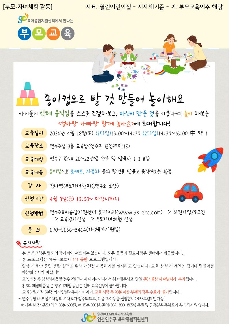 | [°øÅë ºÎ¸ð-ÀÚ³à üÇè] Á¾ÀÌÄÅÀ¸·Î Å» °Í ¸¸µé¾î ³îÀÌÇØ¿ä(À¯¾Æ 1ŸÀÓ) 13:00~14:20 | |||