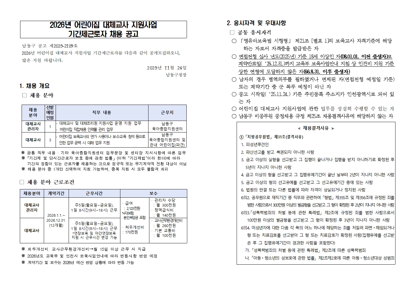 | [³²µ¿±¸] 2026³â ¾î¸°ÀÌÁý ´ëü±³»ç Áö¿ø»ç¾÷ ±â°£Á¦±Ù·ÎÀÚ Ã¤¿ë °ø°í | |||||