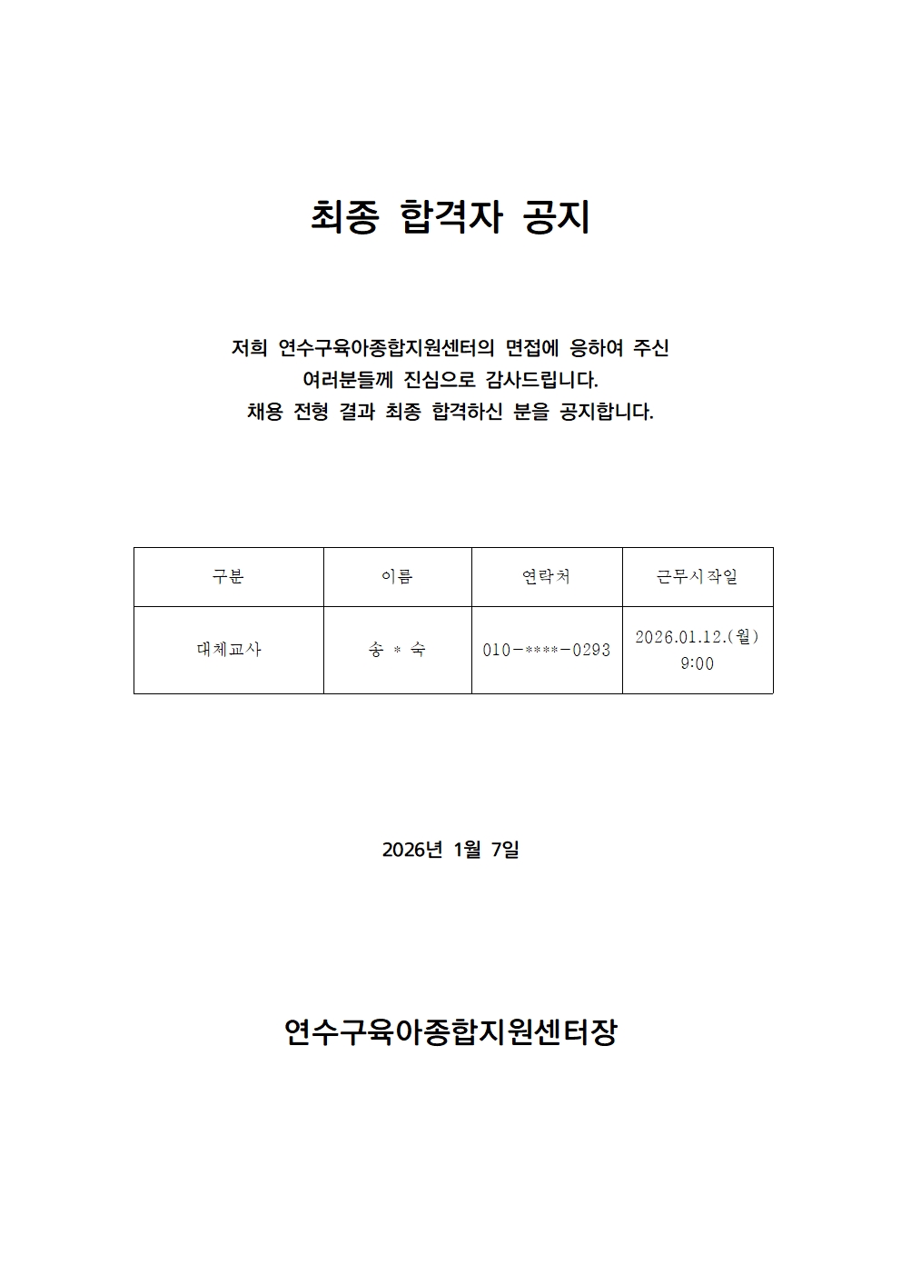 [º»¼¾ÅÍ] 2026³âµµ ¿¬¼ö±¸À°¾ÆÁ¾ÇÕÁö¿ø¼¾ÅÍ ´ëü±³»ç ä¿ë ÃÖÁ¾ ÇÕ°ÝÀÚ °øÁö