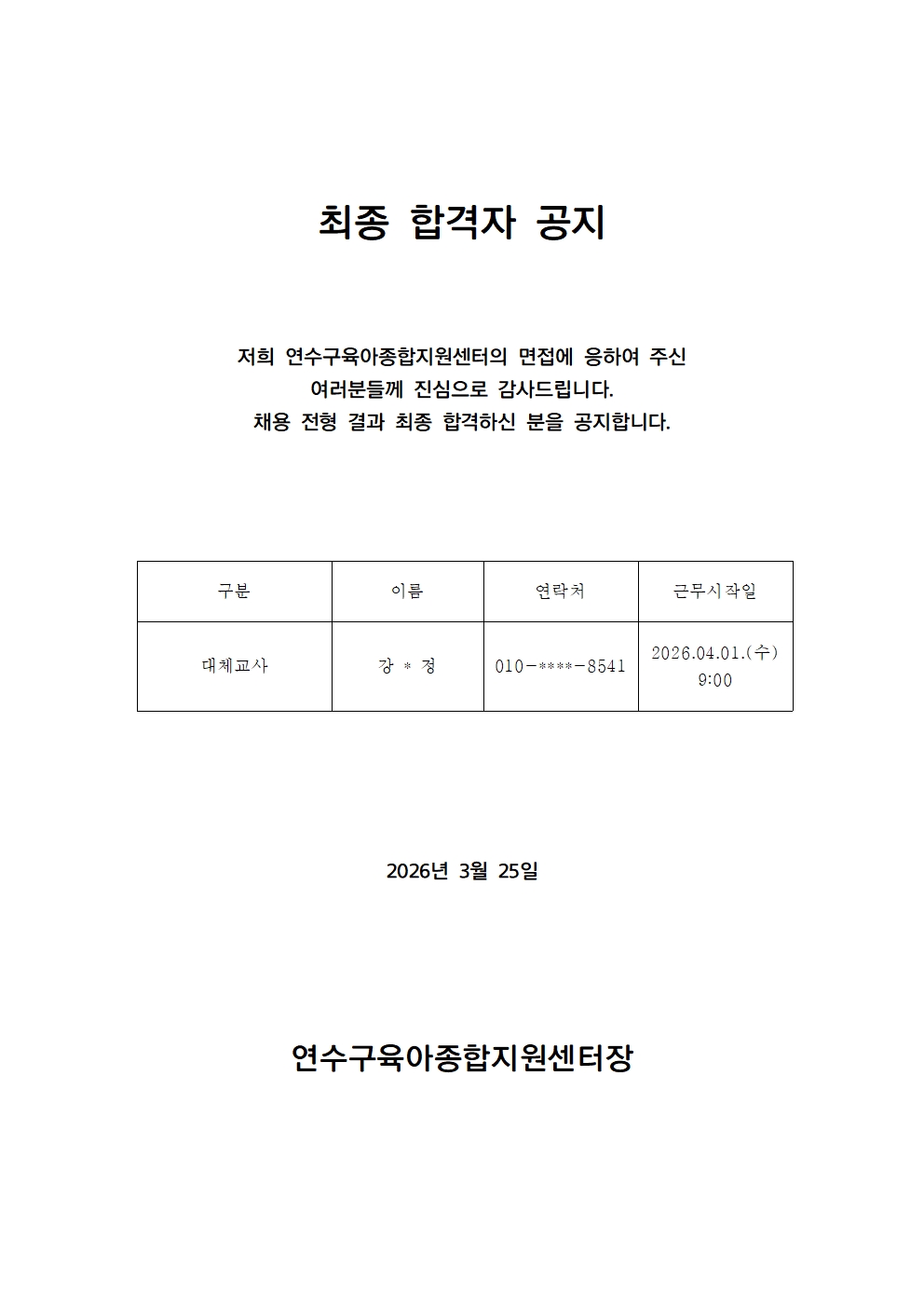 [º»¼¾ÅÍ] 2026³âµµ ¿¬¼ö±¸À°¾ÆÁ¾ÇÕÁö¿ø¼¾ÅÍ ´ëü±³»ç ä¿ë 1Â÷ ÇÕ°ÝÀÚ °øÁö