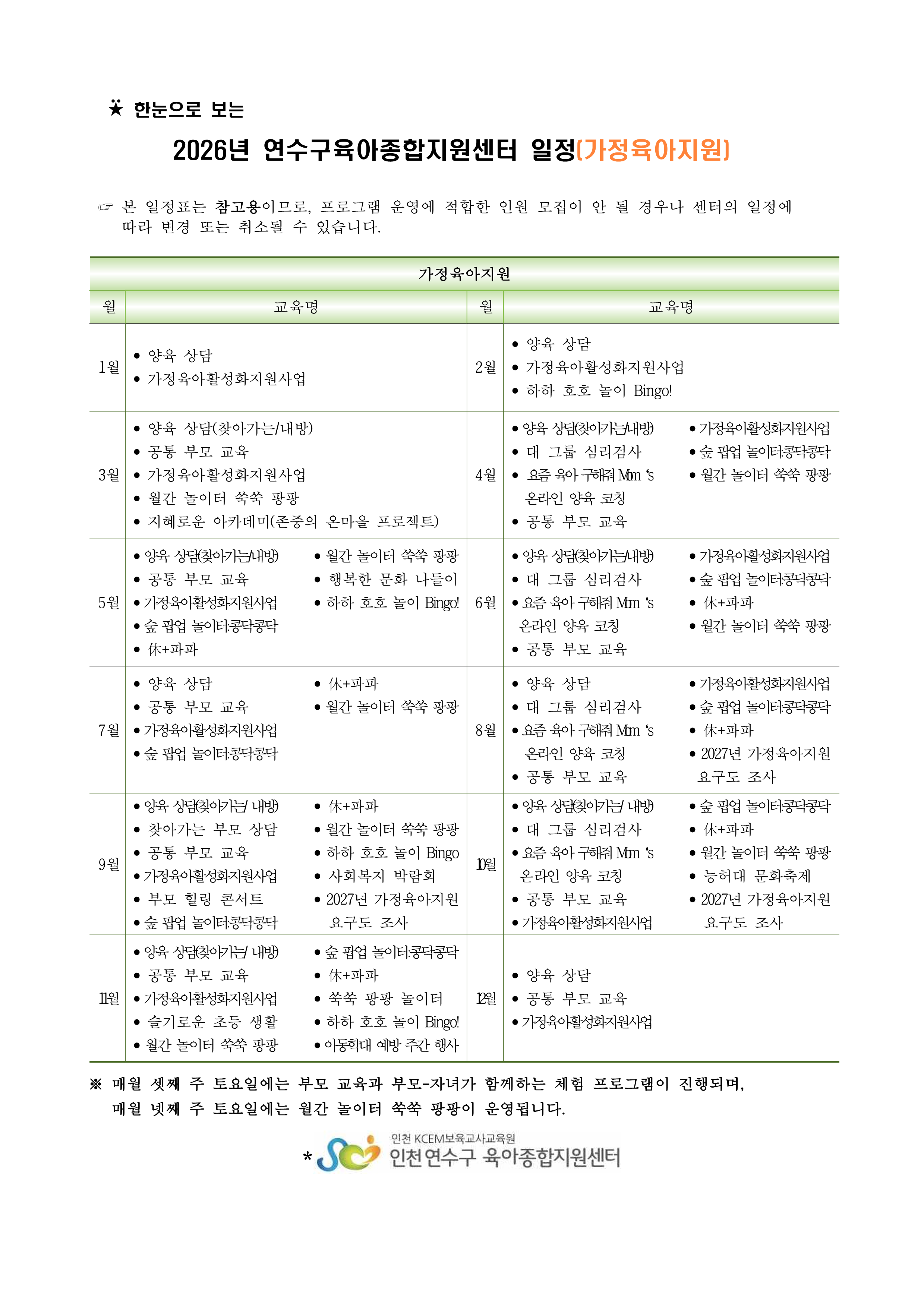 | [º»¼¾ÅÍ] 2026³â °¡Á¤À°¾ÆÁö¿øÆÀ ±³À°(Çà»ç) ÀÏÁ¤ | |||||