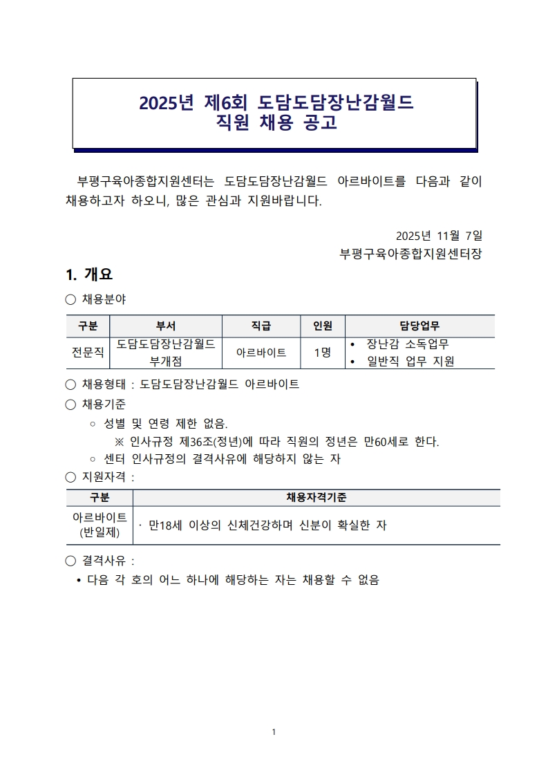 | [ºÎÆò±¸À°¾ÆÁ¾ÇÕÁö¿ø¼¾ÅÍ] µµ´ãµµ´ãÀå³°¨¿ùµå ±â°£Á¦ ±Ù·ÎÀÚ Ã¤¿Ë °ø°í | |||||