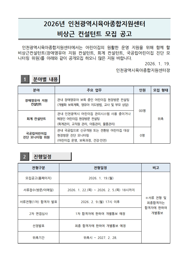 | [ÀÎõ±¤¿ª½ÃÀ°¾ÆÁ¾ÇÕÁö¿ø¼¾ÅÍ] 2026³â ºñ»ó±Ù ÄÁ¼³ÅÏÆ® ¸ðÁý °ø°í | |||||