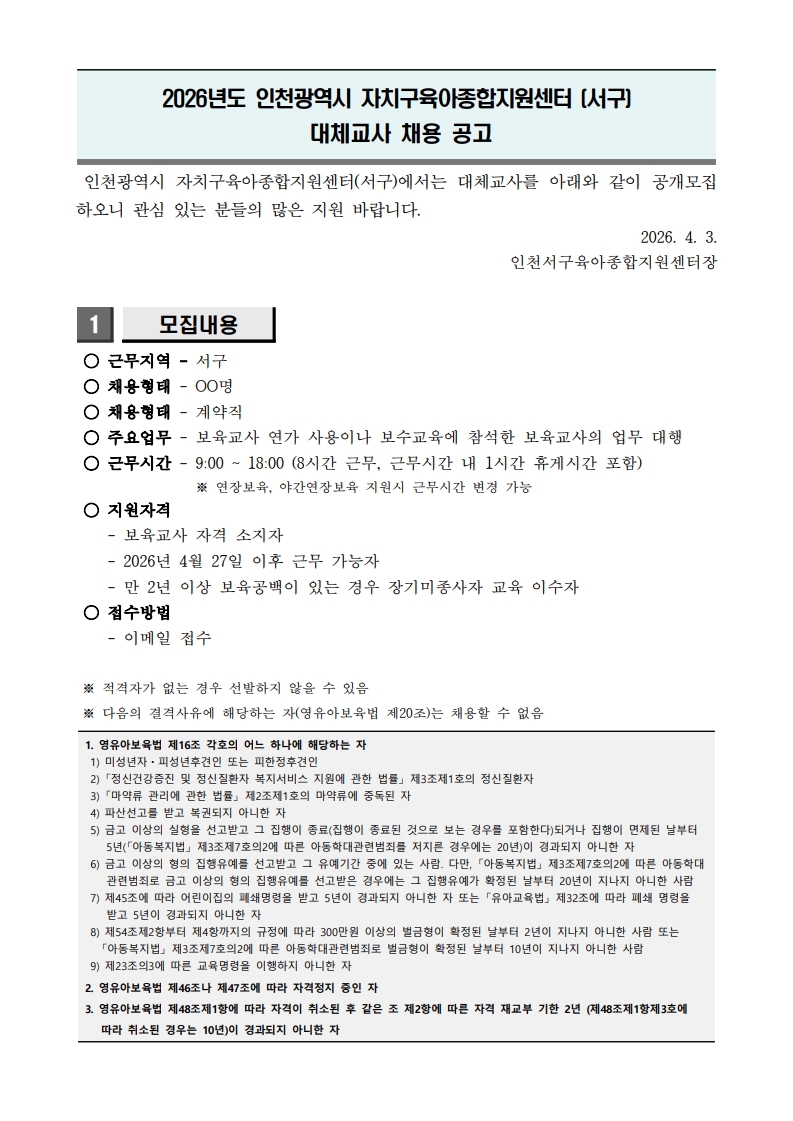 [¼±¸À°¾ÆÁ¾ÇÕÁö¿ø¼¾ÅÍ] ´ëü±³»ç 6Â÷ ä¿ë