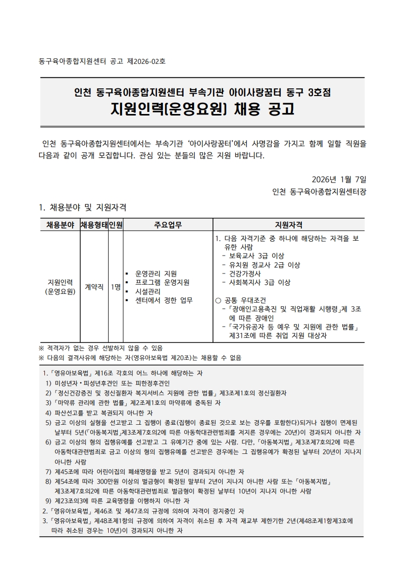 | ´ÙÀ½±Û ¡å | [³²µ¿±¸Ã»] 2026³â ¾î¸°ÀÌÁý ´ëüÁ¶¸®¿ø Áö¿ø»ç¾÷ ±â°£Á¦±Ù·ÎÀÚ Ã¤¿ë | ||||
