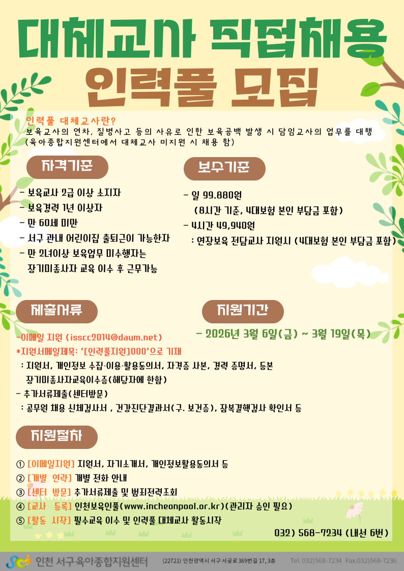 | [ÀÎõ¼±¸À°¾ÆÁ¾ÇÕÁö¿ø¼¾ÅÍ] ´ëü±³»çÁ÷Á¢Ã¤¿ë ÀηÂÇ® ¸ðÁý | |||||