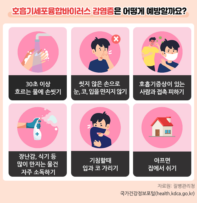 °¡Àå È¿°úÀûÀÎ ¿¹¹æ¹ýÀº ¸Å³â À¯Çà Àü¿¡ ÀÎÇ÷翣ÀÚ ¹é½ÅÀ» Á¢Á¾ÇÏ´Â °ÍÀÔ´Ï´Ù. ¶ÇÇÑ Æò¼Ò ºñ´©·Î 30ÃÊ ÀÌ»ó ¼Õ ¾Ä±â, ±âħ ¿¹Àý Áö۱â, ¾ÆÇà ¶§´Â Áý¿¡¼ ½¬±â¸¦ ½ÇõÇÏ¸é ´Ù¸¥ »ç¶÷¿¡°Ô ¿Å±â´Â °ÍÀ» ÁÙÀÌ´Â µ¥ µµ¿òÀÌ µË´Ï´Ù. 2. È£Èí±â¼¼Æ÷À¶ÇÕ¹ÙÀÌ·¯½º(RSV) °¨¿°Áõ °Ü¿ïö ¿µÀ¯¾Æ È£Èí±â °¨¿°ÀÇ ÈçÇÑ ¿øÀÎÀ¸·Î, ´ëºÎºÐÀÇ ¾ÆÀ̰¡ 2¼¼±îÁö ÇÑ ¹øÂë °¨¿°µÉ Á¤µµ·Î ÈçÇÕ´Ï´Ù.